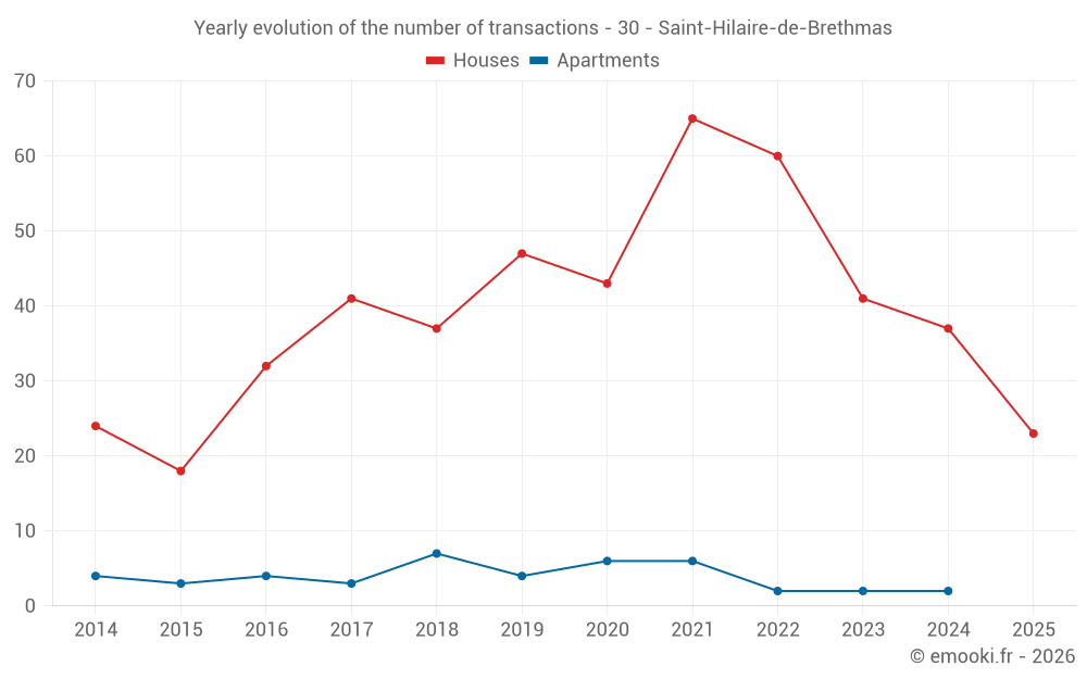 The median price on the 23 house transactions of the last 6 months in the municipality of Saint-Hilaire-de-Brethmas was 2 279 € per square meter for a median property value of 208 000 €. Over this period, 60% of transactions were between 1 832 and 2 688 € per square meter (from the 2nd to the 8th deciles).