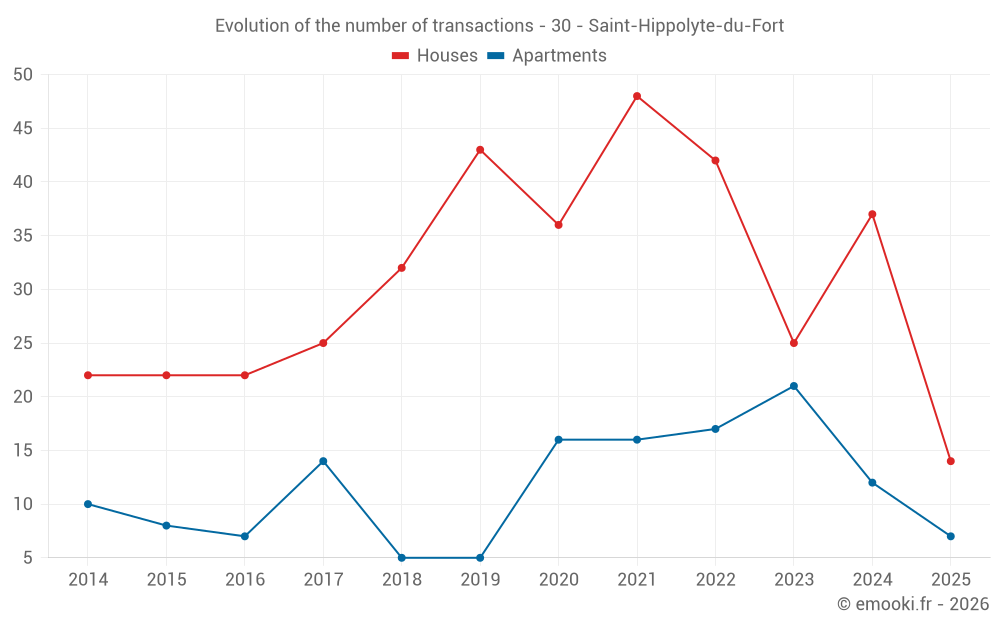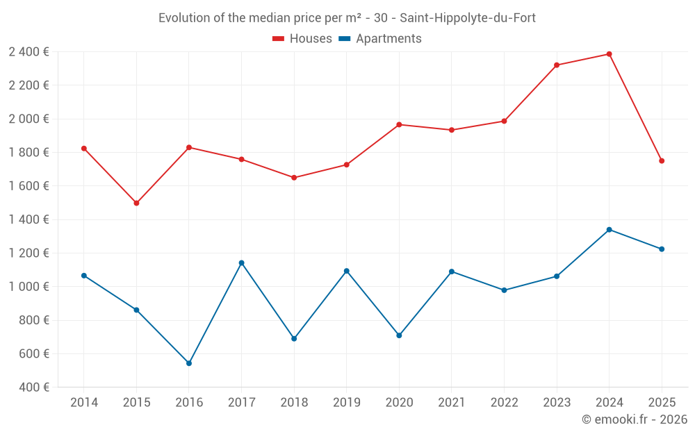 The median price on the 31 house transactions of the last 12 months in the municipality of Saint-Hippolyte-du-Fort was 2 070 € per square meter for a median property value of 199 000 €. Over this period, 60% of transactions were between 1 460 and 2 824 € per square meter (from the 2nd to the 8th deciles).