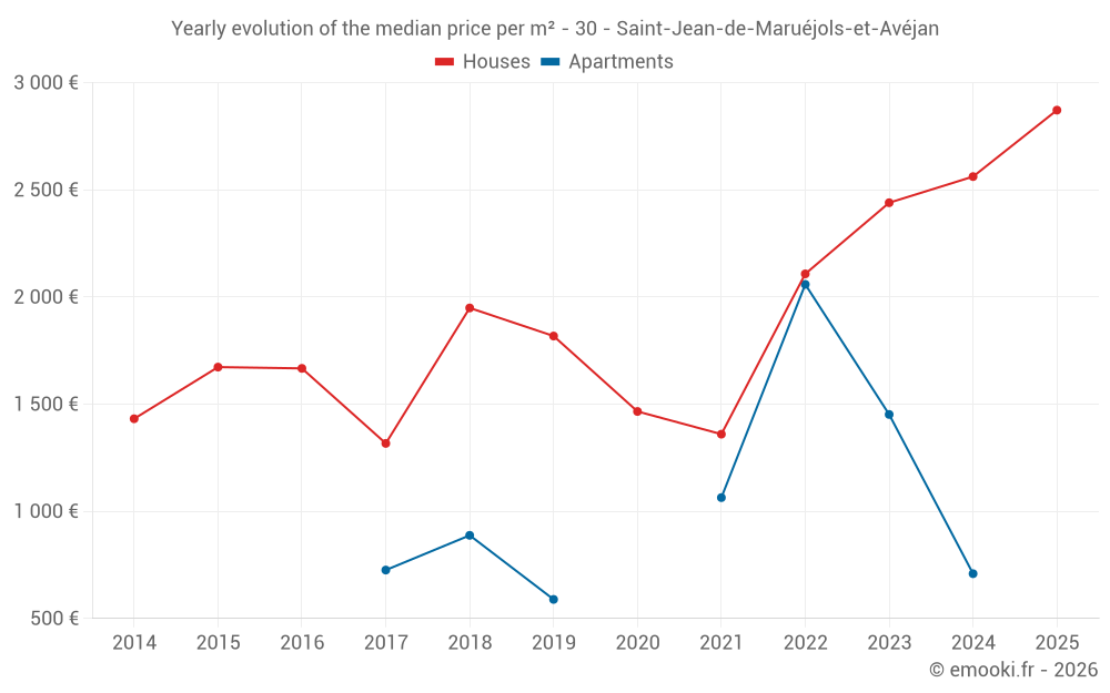 The median price on the 15 house transactions of the last 24 months in the municipality of Saint-Jean-de-Maruéjols-et-Avéjan was 2 683 € per square meter for a median property value of 221 000 €. Over this period, 60% of transactions were between 1 685 and 3 169 € per square meter (from the 2nd to the 8th deciles).