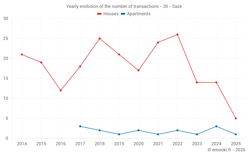 The median price on the 27 house transactions of the last 24 months in the municipality of Saze was 2 491 € per square meter for a median property value of 300 000 €. Over this period, 60% of transactions were between 2 147 and 3 328 € per square meter (from the 2nd to the 8th deciles).