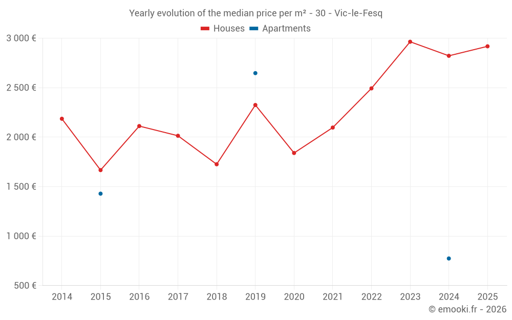 The median price on the 14 house transactions of the last 24 months in the municipality of Vic-le-Fesq was 2 969 € per square meter for a median property value of 302 335 €. Over this period, 60% of transactions were between 2 492 and 3 439 € per square meter (from the 2nd to the 8th deciles).