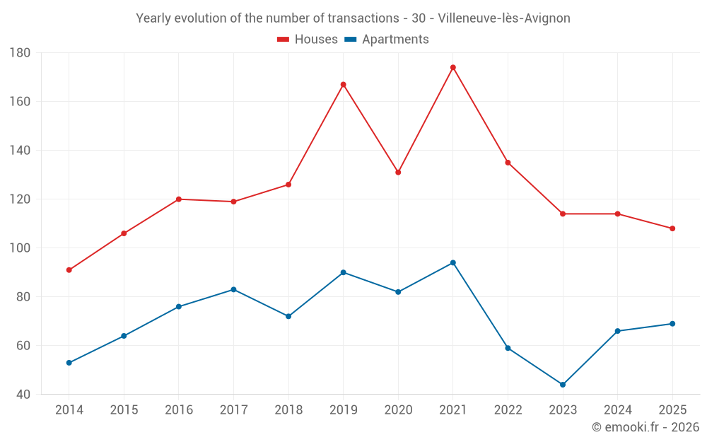 The median price on the 30 house transactions of the last 3 months in the municipality of Villeneuve-lès-Avignon was 3 650 € per square meter for a median property value of 395 000 €. Over this period, 60% of transactions were between 2 793 and 4 877 € per square meter (from the 2nd to the 8th deciles).