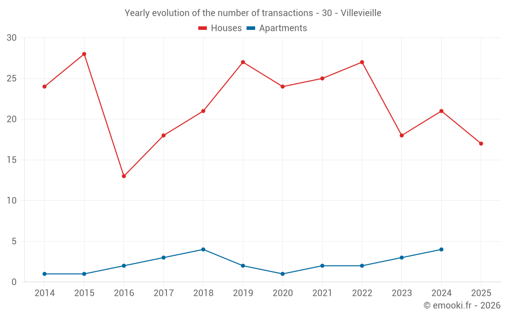 The median price on the 30 house transactions of the last 12 months in the municipality of Villevieille was 2 862 € per square meter for a median property value of 273 750 €. Over this period, 60% of transactions were between 2 569 and 3 632 € per square meter (from the 2nd to the 8th deciles).