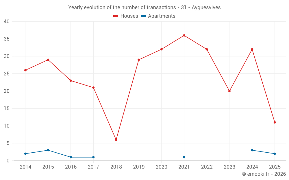 The median price on the 28 house transactions of the last 12 months in the municipality of Ayguesvives was 2 414 € per square meter for a median property value of 222 726 €. Over this period, 60% of transactions were between 1 894 and 3 134 € per square meter (from the 2nd to the 8th deciles).