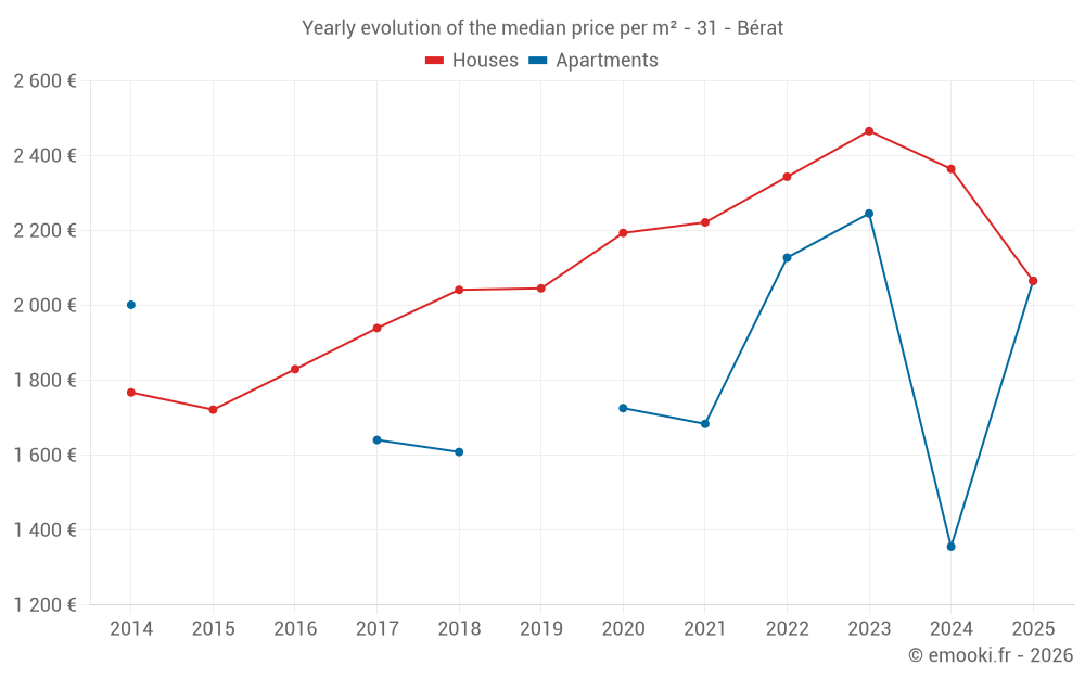 The median price on the 23 house transactions of the last 12 months in the municipality of Bérat was 2 321 € per square meter for a median property value of 247 500 €. Over this period, 60% of transactions were between 1 794 and 2 733 € per square meter (from the 2nd to the 8th deciles).