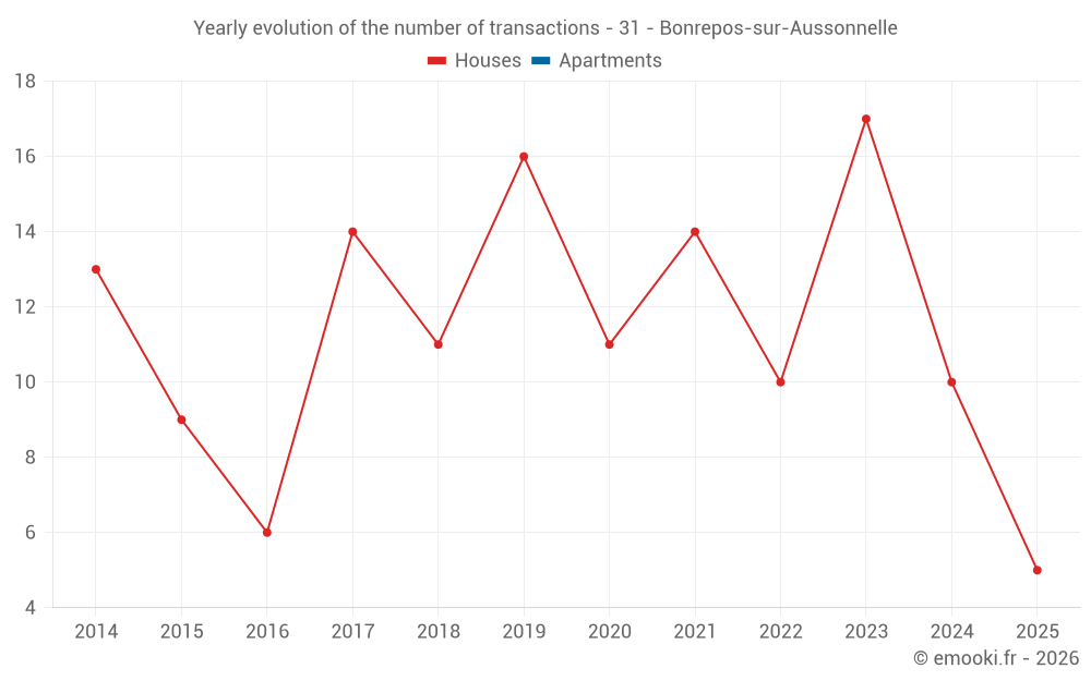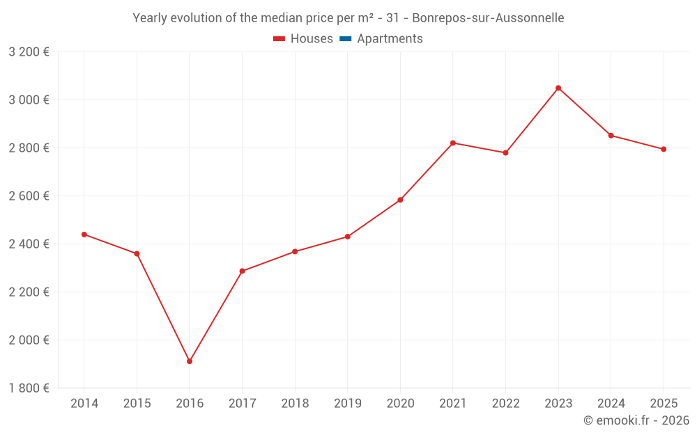The median price on the 26 house transactions of the last 24 months in the municipality of Bonrepos-sur-Aussonnelle was 2 923 € per square meter for a median property value of 335 412 €. Over this period, 60% of transactions were between 2 425 and 3 475 € per square meter (from the 2nd to the 8th deciles).