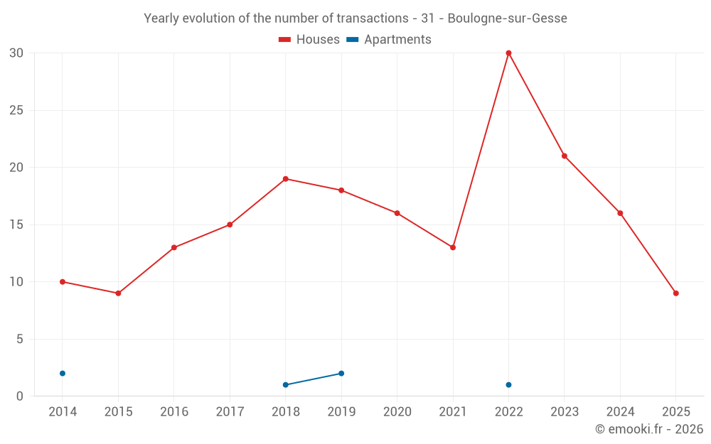 The median price on the 37 house transactions of the last 24 months in the municipality of Boulogne-sur-Gesse was 1 048 € per square meter for a median property value of 100 000 €. Over this period, 60% of transactions were between 545 and 1 864 € per square meter (from the 2nd to the 8th deciles).