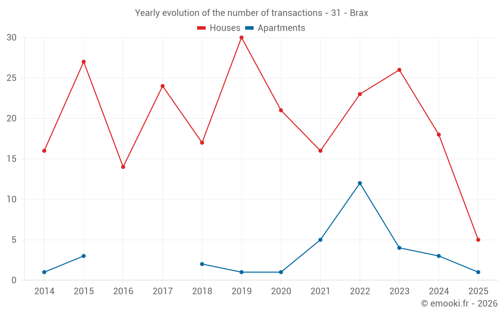 The median price on the 18 house transactions of the last 12 months in the municipality of Brax was 3 127 € per square meter for a median property value of 298 275 €. Over this period, 60% of transactions were between 2 856 and 3 751 € per square meter (from the 2nd to the 8th deciles).