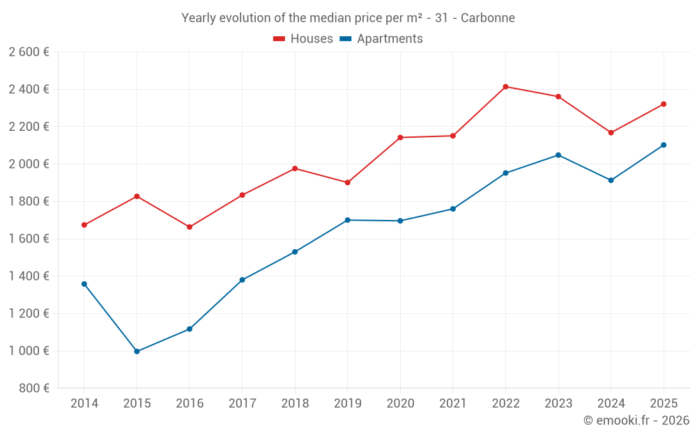 The median price on the 19 house transactions of the last 6 months in the municipality of Carbonne was 2 321 € per square meter for a median property value of 230 000 €. Over this period, 60% of transactions were between 1 959 and 2 675 € per square meter (from the 2nd to the 8th deciles).