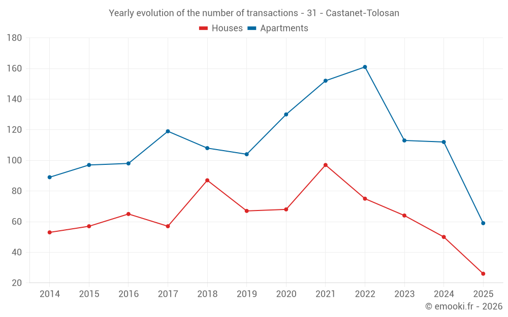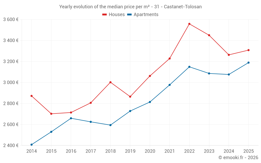 The median price on the 26 house transactions of the last 6 months in the municipality of Castanet-Tolosan was 3 308 € per square meter for a median property value of 374 750 €. Over this period, 60% of transactions were between 2 381 and 4 288 € per square meter (from the 2nd to the 8th deciles).