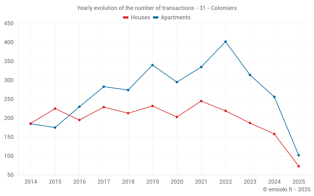 The median price on the 31 apartment transactions of the last 3 months in the municipality of Colomiers was 2 663 € per square meter for a median property value of 157 000 €. Over this period, 60% of transactions were between 2 222 and 2 895 € per square meter (from the 2nd to the 8th deciles).