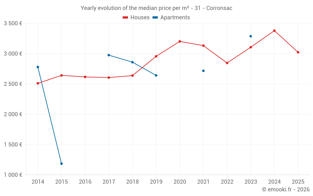 The median price on the 15 house transactions of the last 24 months in the municipality of Corronsac was 3 273 € per square meter for a median property value of 421 900 €. Over this period, 60% of transactions were between 2 802 and 3 672 € per square meter (from the 2nd to the 8th deciles).