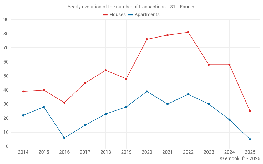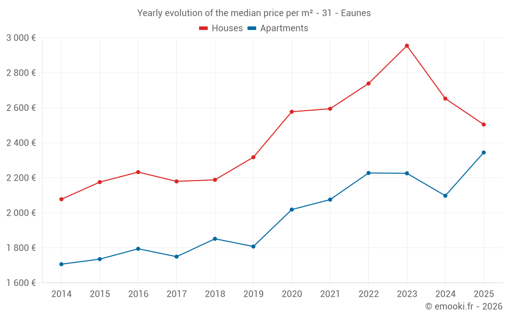 The median price on the 25 house transactions of the last 6 months in the municipality of Eaunes was 2 505 € per square meter for a median property value of 255 900 €. Over this period, 60% of transactions were between 2 055 and 3 006 € per square meter (from the 2nd to the 8th deciles).