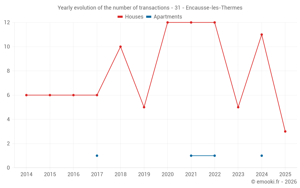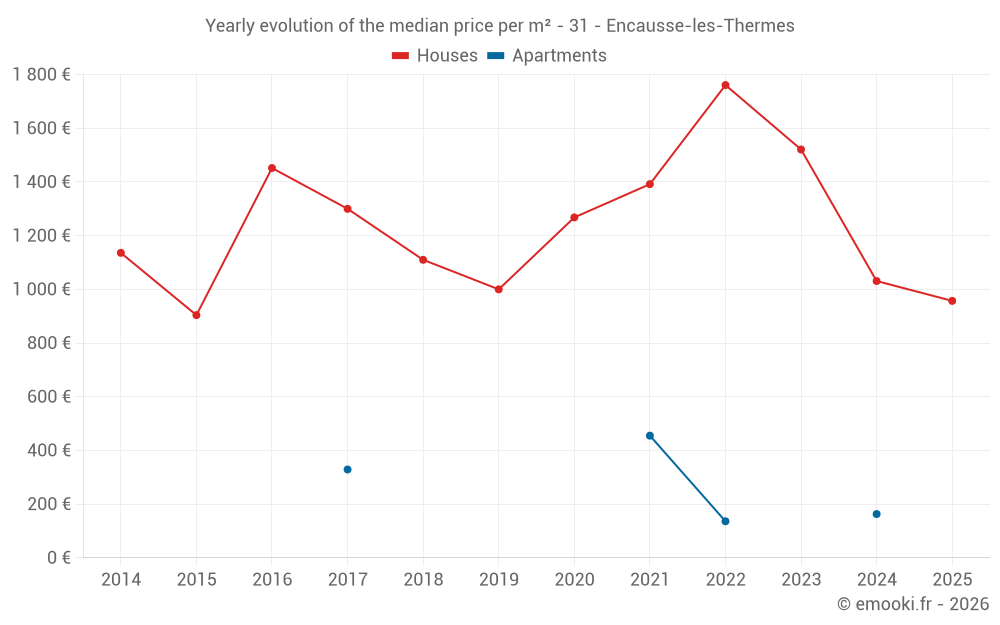 The median price on the 16 house transactions of the last 24 months in the municipality of Encausse-les-Thermes was 1 084 € per square meter for a median property value of 114 500 €. Over this period, 60% of transactions were between 698 and 1 626 € per square meter (from the 2nd to the 8th deciles).
