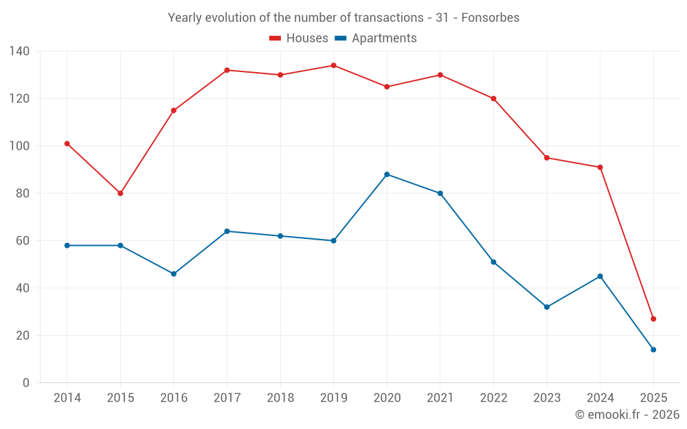 The median price on the 27 house transactions of the last 6 months in the municipality of Fonsorbes was 2 708 € per square meter for a median property value of 261 500 €. Over this period, 60% of transactions were between 2 333 and 3 177 € per square meter (from the 2nd to the 8th deciles).