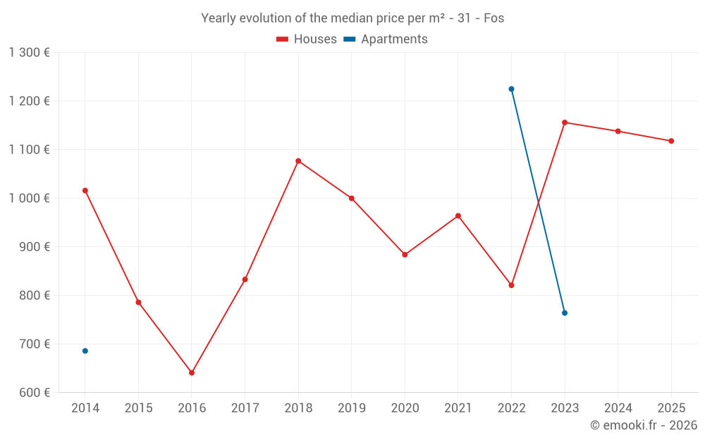 The median price on the 21 house transactions of the last 24 months in the municipality of Fos was 1 138 € per square meter for a median property value of 95 000 €. Over this period, 60% of transactions were between 745 and 2 100 € per square meter (from the 2nd to the 8th deciles).