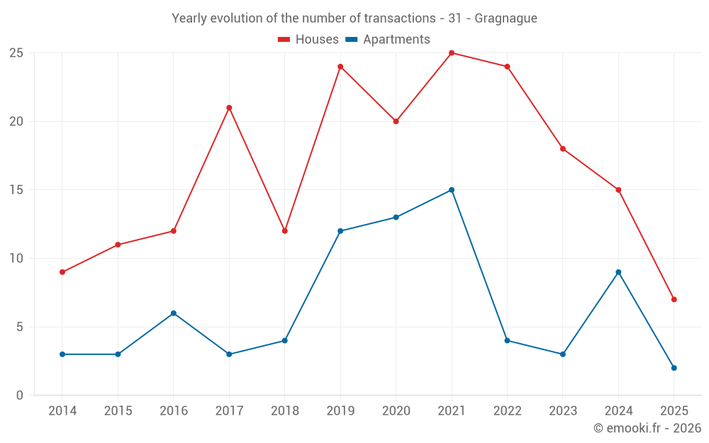 The median price on the 18 house transactions of the last 12 months in the municipality of Gragnague was 3 609 € per square meter for a median property value of 417 350 €. Over this period, 60% of transactions were between 3 000 and 3 754 € per square meter (from the 2nd to the 8th deciles).