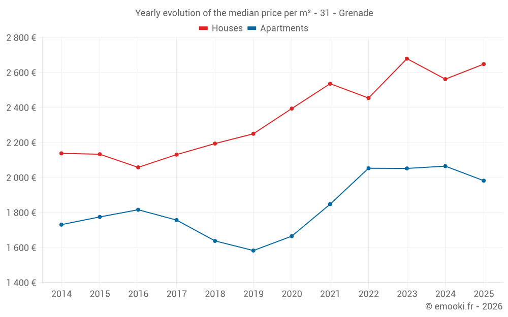 The median price on the 28 house transactions of the last 6 months in the municipality of Grenade was 2 650 € per square meter for a median property value of 277 100 €. Over this period, 60% of transactions were between 2 079 and 2 915 € per square meter (from the 2nd to the 8th deciles).