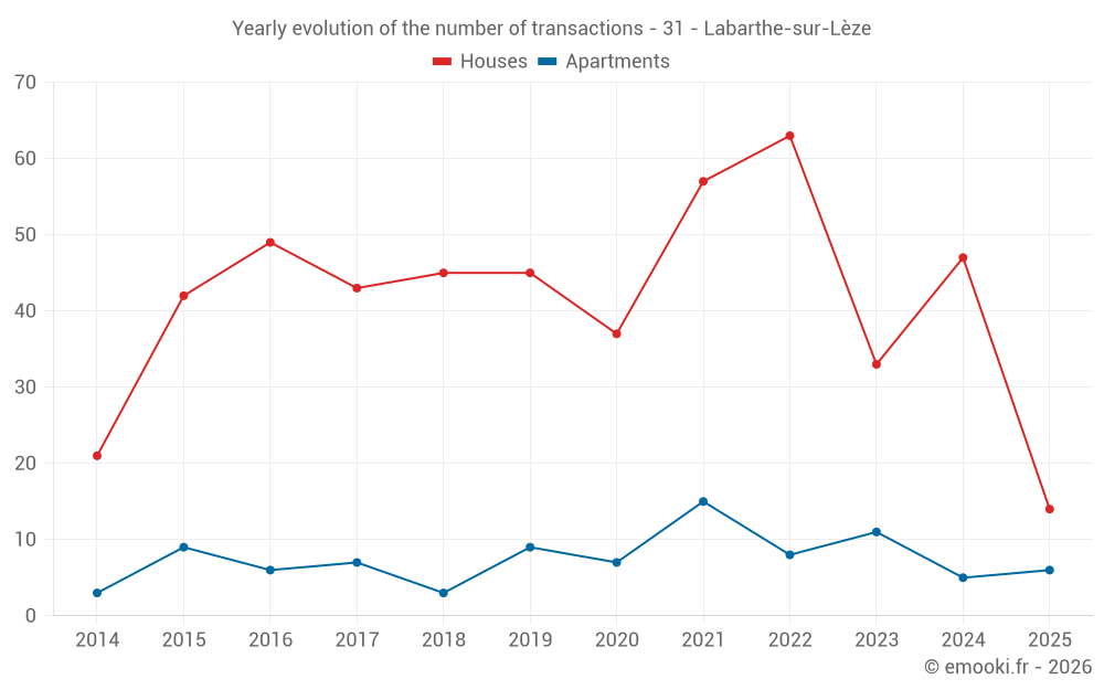 The median price on the 17 apartment transactions of the last 24 months in the municipality of Labarthe-sur-Lèze was 2 330 € per square meter for a median property value of 137 000 €. Over this period, 60% of transactions were between 2 145 and 2 735 € per square meter (from the 2nd to the 8th deciles).