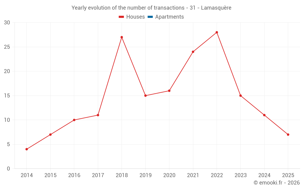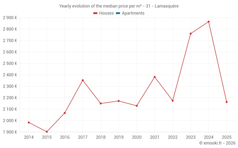 The median price on the 28 house transactions of the last 24 months in the municipality of Lamasquère was 2 746 € per square meter for a median property value of 257 025 €. Over this period, 60% of transactions were between 2 010 and 3 188 € per square meter (from the 2nd to the 8th deciles).
