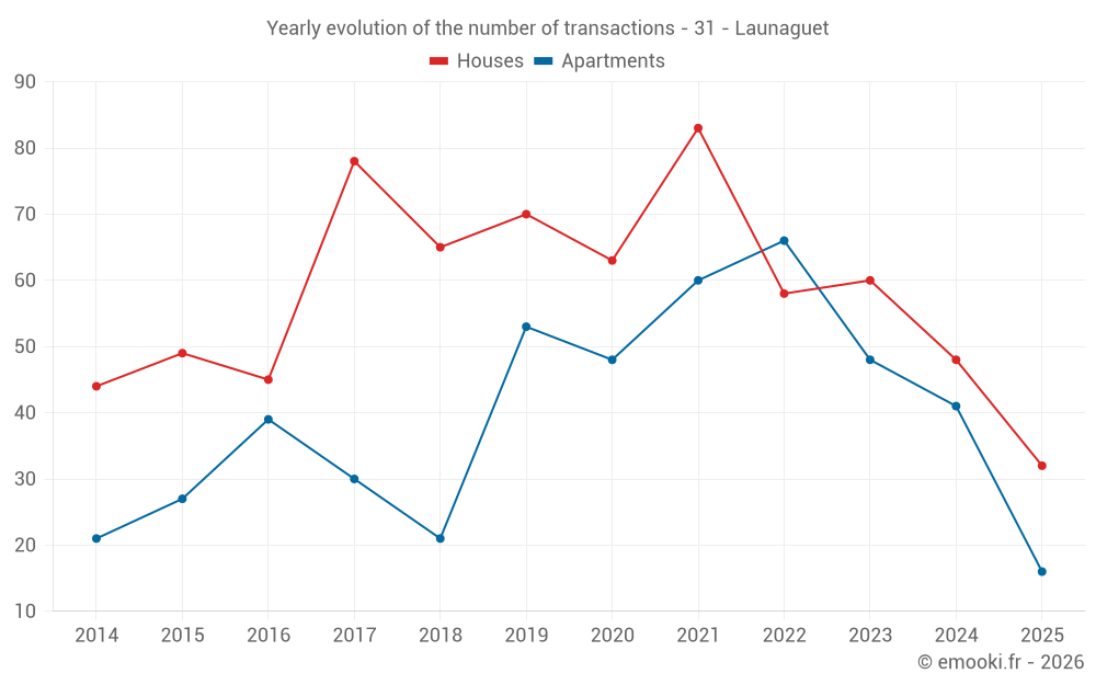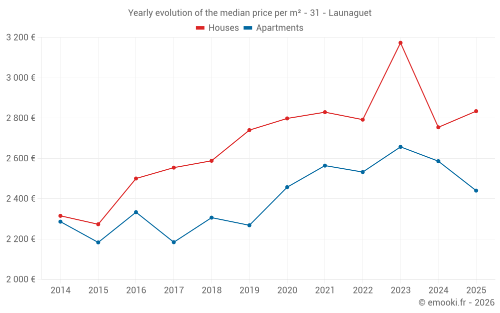 The median price on the 40 apartment transactions of the last 12 months in the municipality of Launaguet was 2 478 € per square meter for a median property value of 132 500 €. Over this period, 60% of transactions were between 2 144 and 2 882 € per square meter (from the 2nd to the 8th deciles).