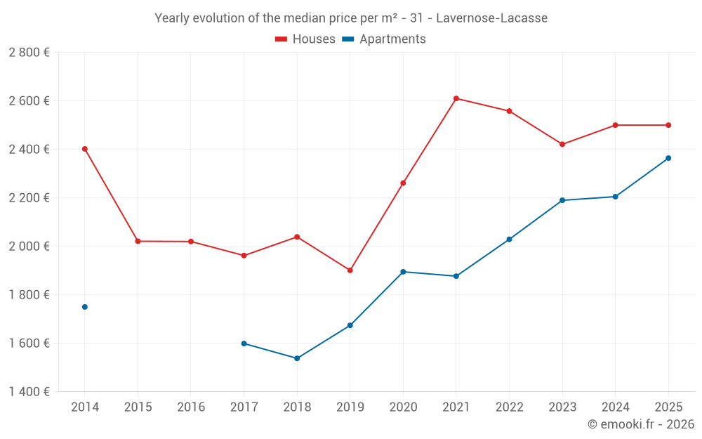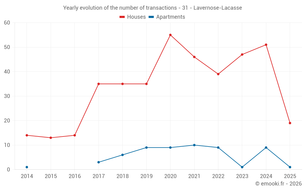 The median price on the 19 house transactions of the last 6 months in the municipality of Lavernose-Lacasse was 2 500 € per square meter for a median property value of 214 860 €. Over this period, 60% of transactions were between 2 039 and 2 890 € per square meter (from the 2nd to the 8th deciles).