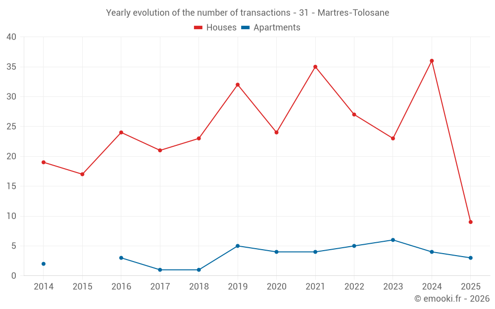 The median price on the 33 house transactions of the last 12 months in the municipality of Martres-Tolosane was 1 640 € per square meter for a median property value of 145 550 €. Over this period, 60% of transactions were between 1 146 and 2 194 € per square meter (from the 2nd to the 8th deciles).