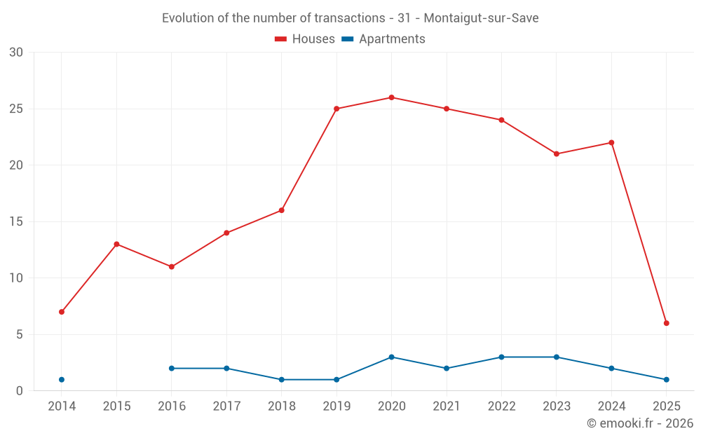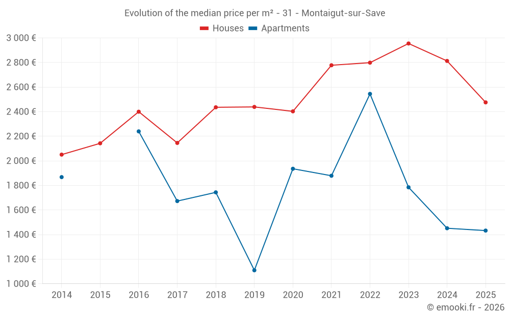 The median price on the 21 house transactions of the last 12 months in the municipality of Montaigut-sur-Save was 2 811 € per square meter for a median property value of 278 000 €. Over this period, 60% of transactions were between 2 645 and 2 926 € per square meter (from the 2nd to the 8th deciles).