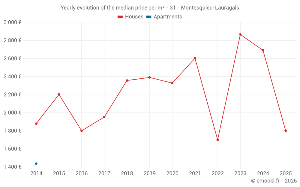 The median price on the 25 house transactions of the last 24 months in the municipality of Montesquieu-Lauragais was 2 415 € per square meter for a median property value of 220 000 €. Over this period, 60% of transactions were between 1 390 and 3 017 € per square meter (from the 2nd to the 8th deciles).