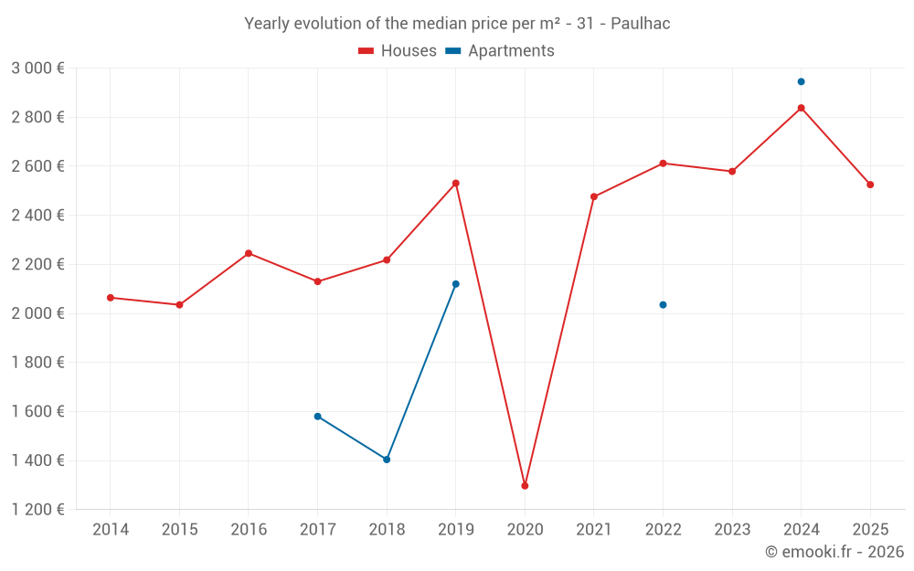 The median price on the 21 house transactions of the last 24 months in the municipality of Paulhac was 2 749 € per square meter for a median property value of 296 450 €. Over this period, 60% of transactions were between 2 391 and 3 242 € per square meter (from the 2nd to the 8th deciles).