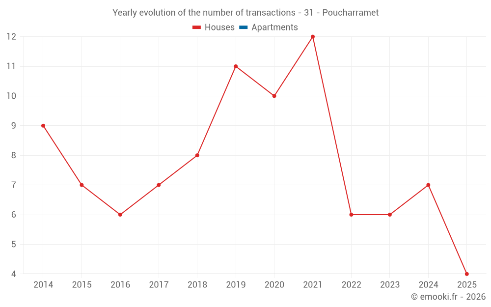 The median price on the 14 house transactions of the last 24 months in the municipality of Poucharramet was 2 202 € per square meter for a median property value of 247 735 €. Over this period, 60% of transactions were between 1 823 and 3 292 € per square meter (from the 2nd to the 8th deciles).