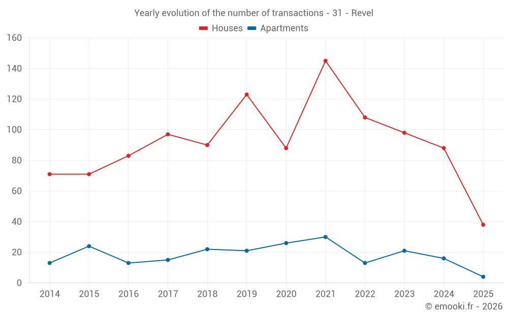 The median price on the 20 house transactions of the last 3 months in the municipality of Revel was 1 843 € per square meter for a median property value of 170 000 €. Over this period, 60% of transactions were between 1 279 and 2 314 € per square meter (from the 2nd to the 8th deciles).