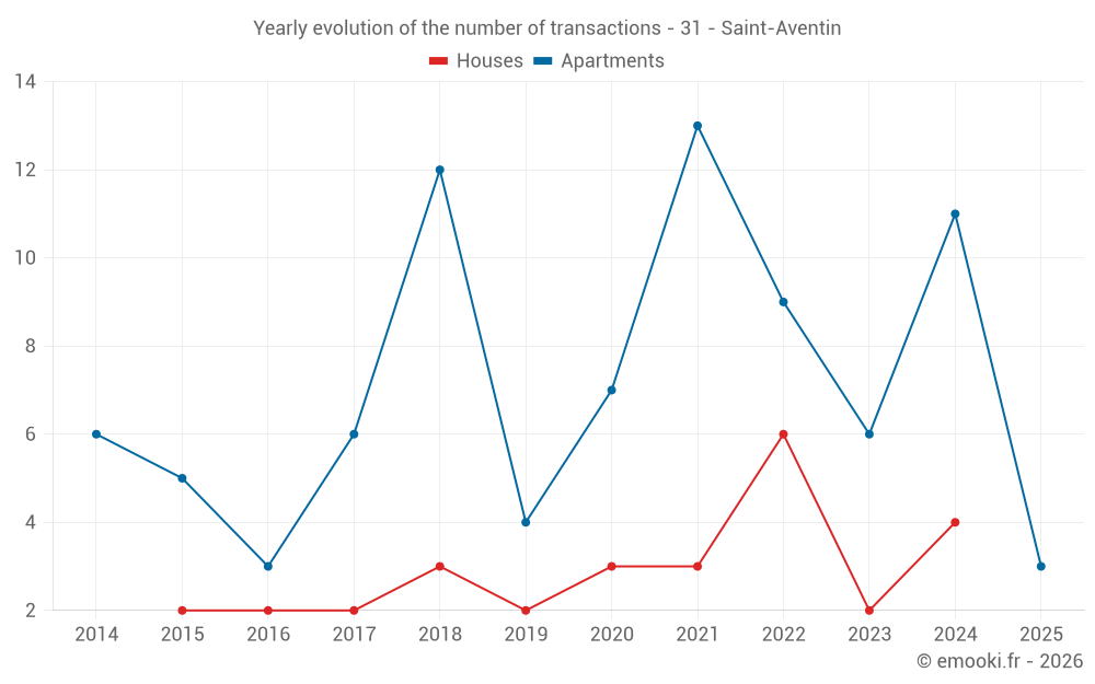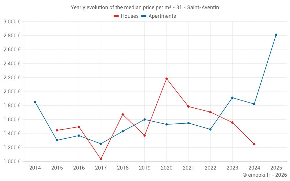 The median price on the 17 apartment transactions of the last 24 months in the municipality of Saint-Aventin was 1 827 € per square meter for a median property value of 45 740 €. Over this period, 60% of transactions were between 1 611 and 2 611 € per square meter (from the 2nd to the 8th deciles).