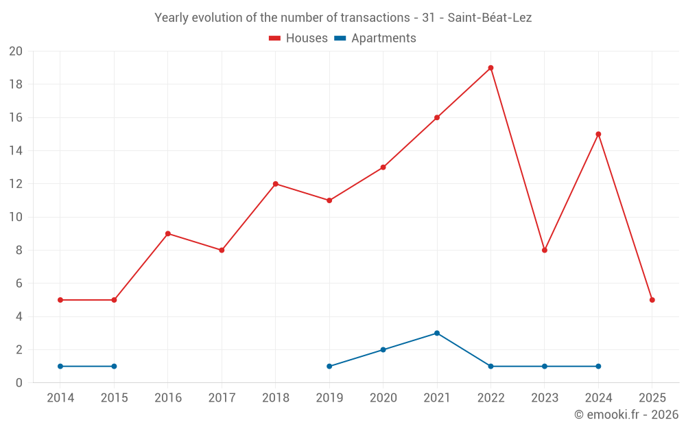 The median price on the 22 house transactions of the last 24 months in the municipality of Saint-Béat-Lez was 1 286 € per square meter for a median property value of 76 000 €. Over this period, 60% of transactions were between 400 and 2 176 € per square meter (from the 2nd to the 8th deciles).