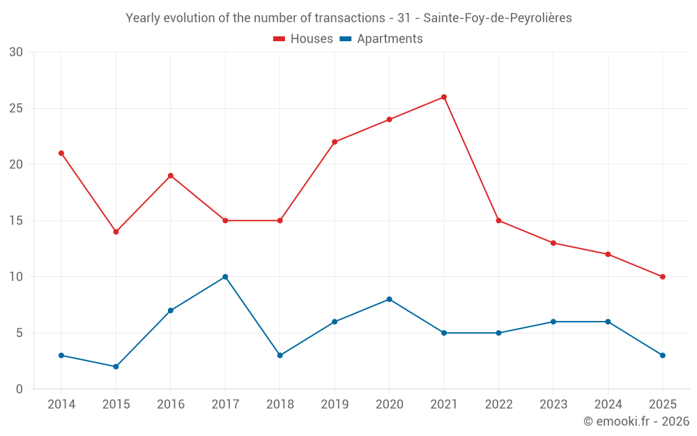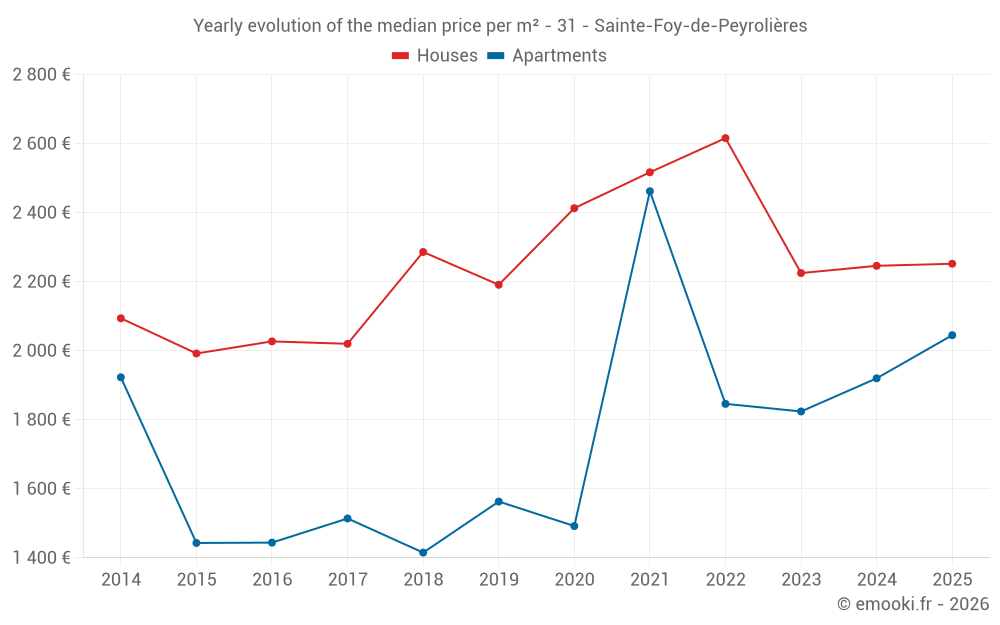 The median price on the 19 house transactions of the last 12 months in the municipality of Sainte-Foy-de-Peyrolières was 2 326 € per square meter for a median property value of 288 450 €. Over this period, 60% of transactions were between 1 703 and 2 801 € per square meter (from the 2nd to the 8th deciles).
