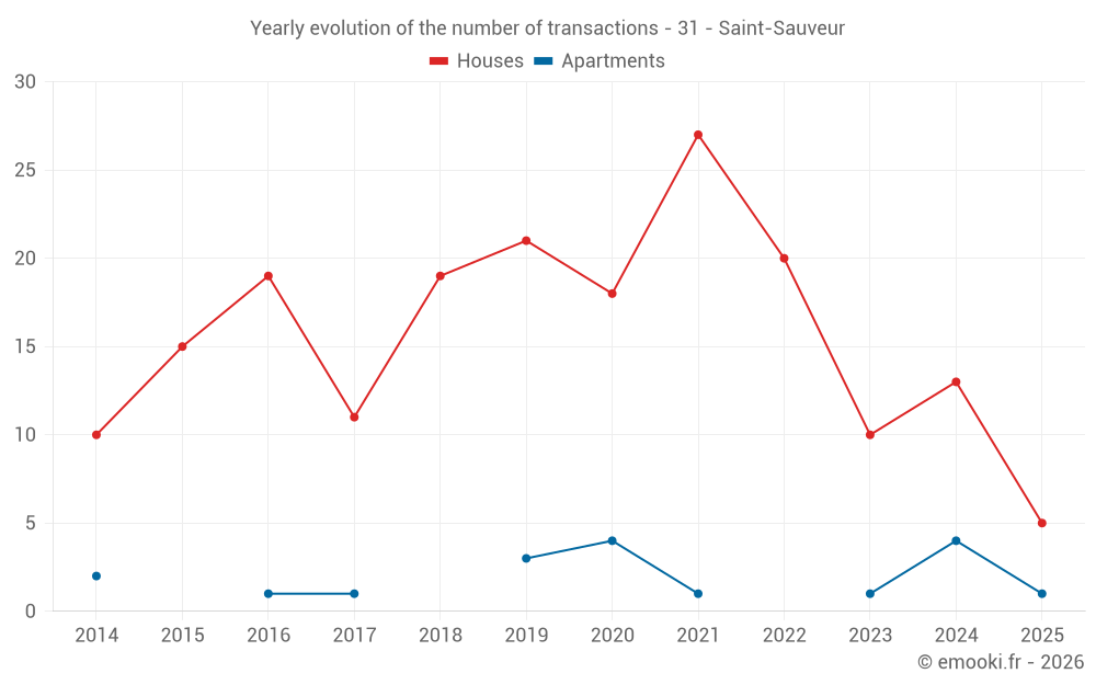 The median price on the 23 house transactions of the last 24 months in the municipality of Saint-Sauveur was 2 779 € per square meter for a median property value of 280 000 €. Over this period, 60% of transactions were between 2 182 and 3 260 € per square meter (from the 2nd to the 8th deciles).