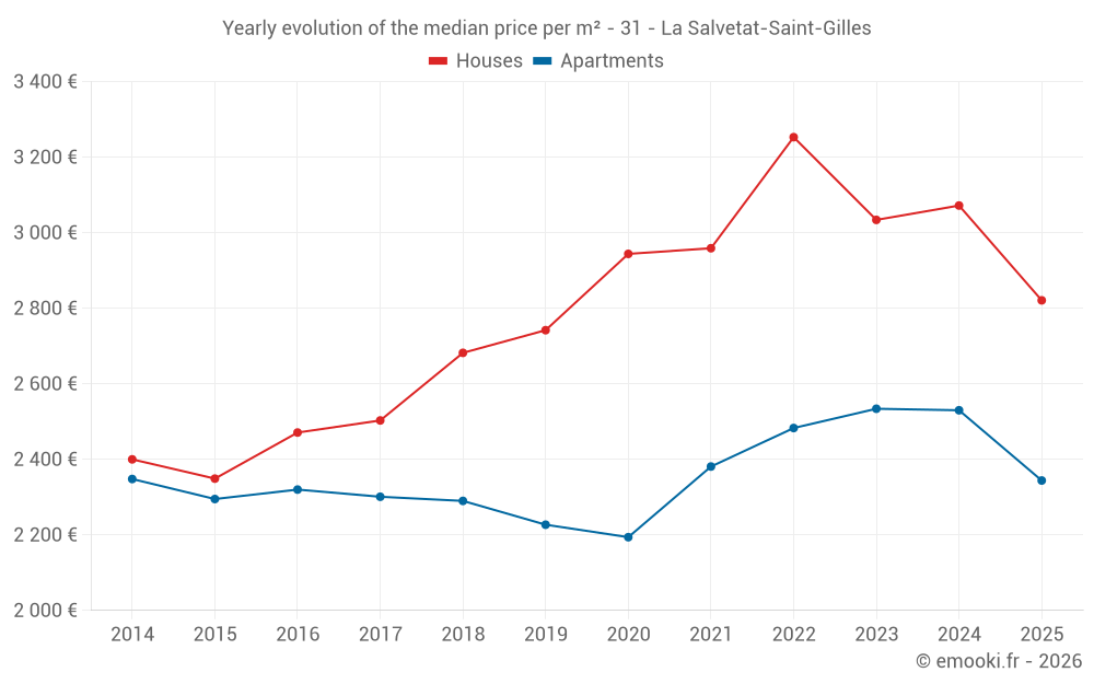 The median price on the 22 house transactions of the last 6 months in the municipality of La Salvetat-Saint-Gilles was 2 821 € per square meter for a median property value of 245 605 €. Over this period, 60% of transactions were between 2 346 and 3 138 € per square meter (from the 2nd to the 8th deciles).