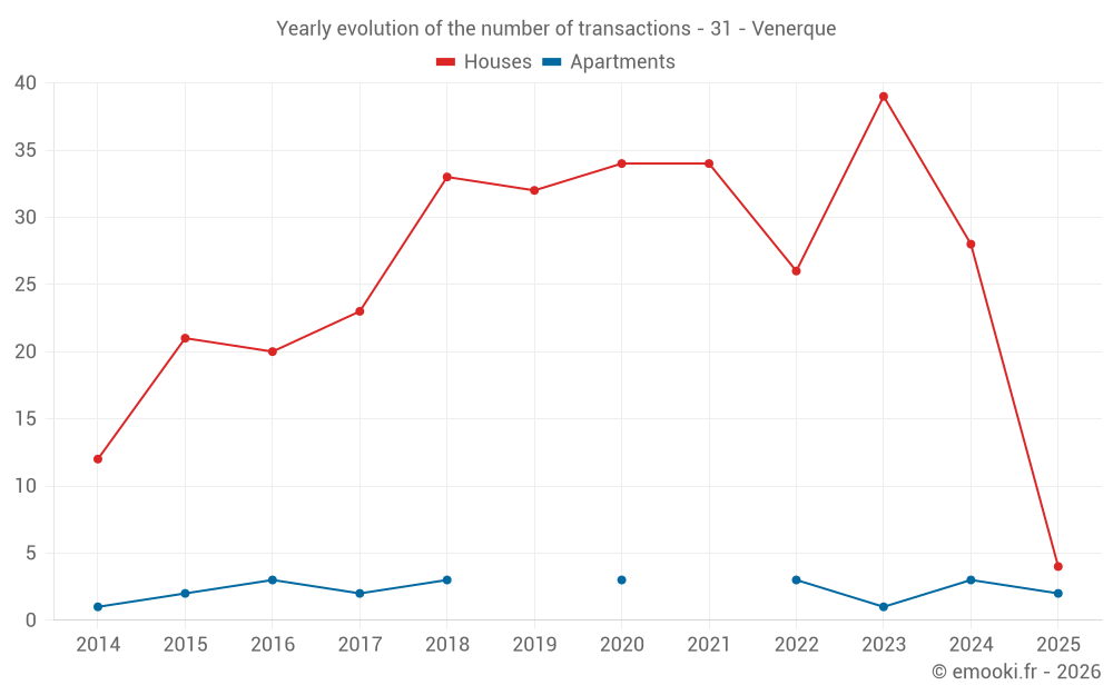 The median price on the 16 house transactions of the last 12 months in the municipality of Venerque was 2 914 € per square meter for a median property value of 301 482 €. Over this period, 60% of transactions were between 2 537 and 3 548 € per square meter (from the 2nd to the 8th deciles).
