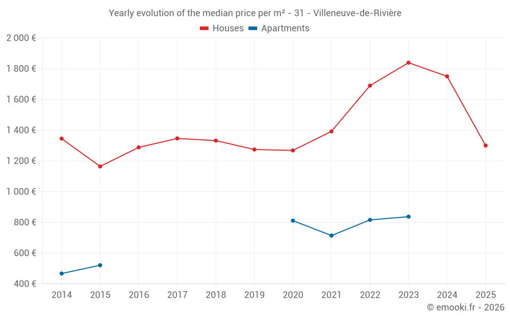 The median price on the 17 house transactions of the last 12 months in the municipality of Villeneuve-de-Rivière was 1 399 € per square meter for a median property value of 195 420 €. Over this period, 60% of transactions were between 919 and 1 889 € per square meter (from the 2nd to the 8th deciles).