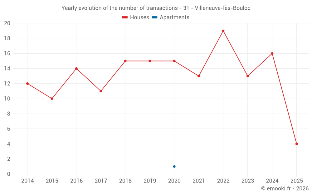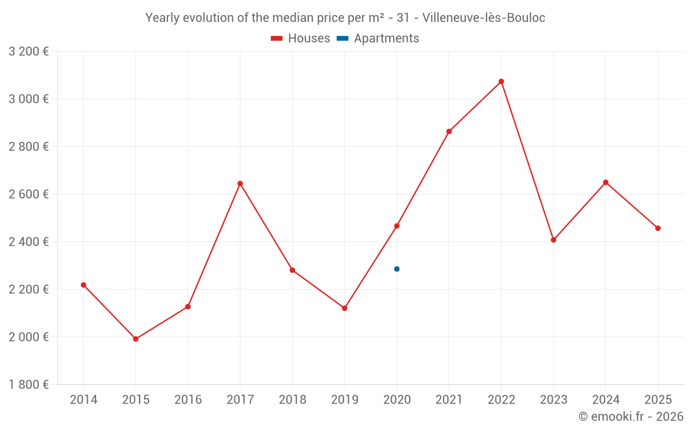 The median price on the 28 house transactions of the last 24 months in the municipality of Villeneuve-lès-Bouloc was 2 546 € per square meter for a median property value of 289 725 €. Over this period, 60% of transactions were between 1 940 and 3 001 € per square meter (from the 2nd to the 8th deciles).