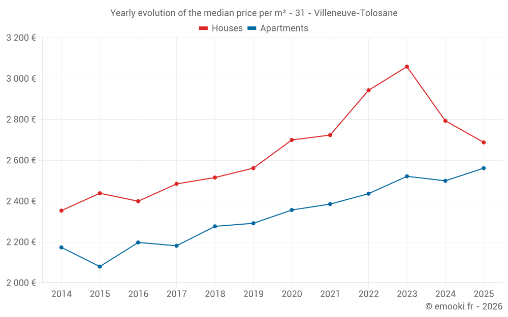 The median price on the 28 house transactions of the last 6 months in the municipality of Villeneuve-Tolosane was 2 688 € per square meter for a median property value of 252 450 €. Over this period, 60% of transactions were between 2 254 and 3 154 € per square meter (from the 2nd to the 8th deciles).