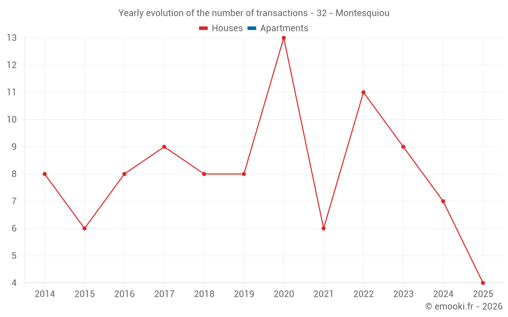 The median price on the 16 house transactions of the last 24 months in the municipality of Montesquiou was 1 526 € per square meter for a median property value of 129 990 €. Over this period, 60% of transactions were between 357 and 1 832 € per square meter (from the 2nd to the 8th deciles).