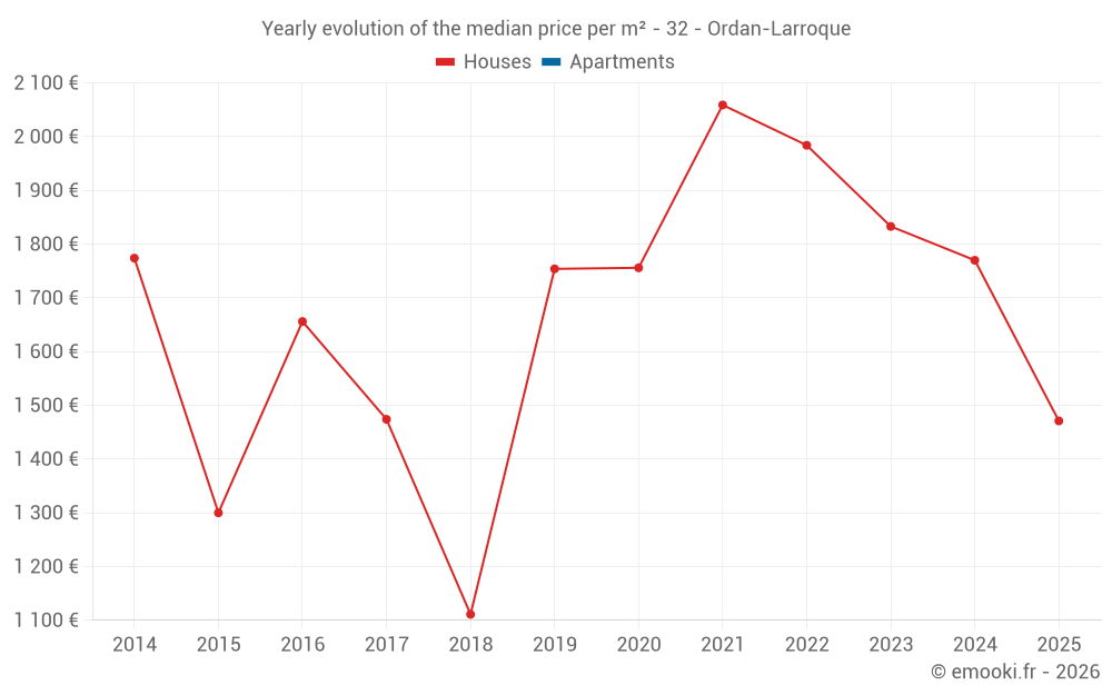 The median price on the 14 house transactions of the last 24 months in the municipality of Ordan-Larroque was 1 763 € per square meter for a median property value of 216 667 €. Over this period, 60% of transactions were between 1 387 and 2 136 € per square meter (from the 2nd to the 8th deciles).