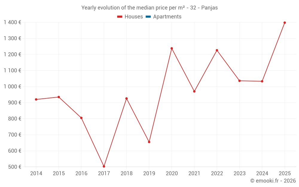 The median price on the 14 house transactions of the last 24 months in the municipality of Panjas was 1 150 € per square meter for a median property value of 120 000 €. Over this period, 60% of transactions were between 523 and 1 508 € per square meter (from the 2nd to the 8th deciles).