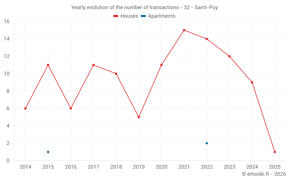 The median price on the 16 house transactions of the last 24 months in the municipality of Saint-Puy was 1 288 € per square meter for a median property value of 144 000 €. Over this period, 60% of transactions were between 667 and 1 762 € per square meter (from the 2nd to the 8th deciles).