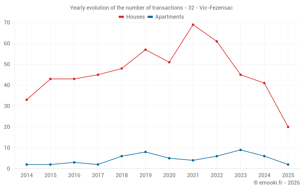 The median price on the 20 house transactions of the last 6 months in the municipality of Vic-Fezensac was 1 084 € per square meter for a median property value of 111 155 €. Over this period, 60% of transactions were between 457 and 1 685 € per square meter (from the 2nd to the 8th deciles).