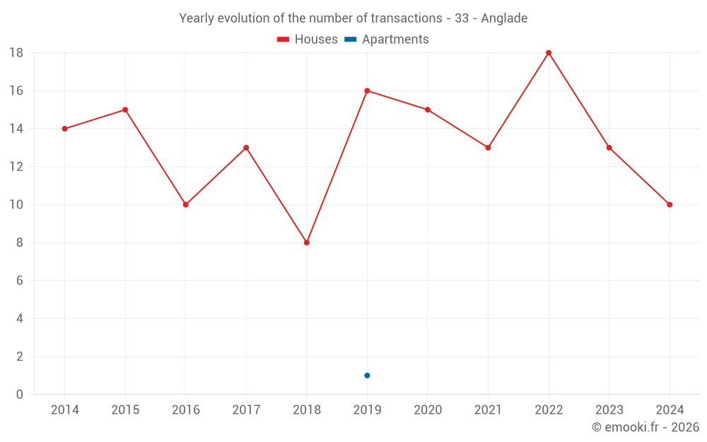 The median price on the 17 house transactions of the last 24 months in the municipality of Anglade was 1 279 € per square meter for a median property value of 119 999 €. Over this period, 60% of transactions were between 706 and 1 929 € per square meter (from the 2nd to the 8th deciles).