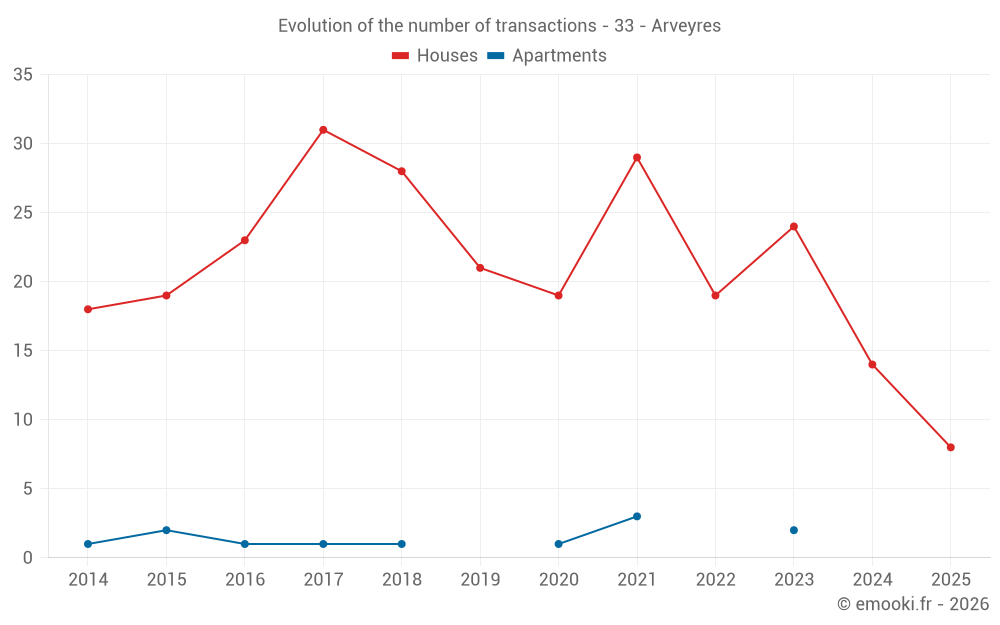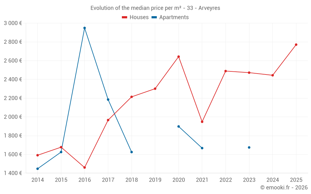 The median price on the 16 house transactions of the last 12 months in the municipality of Arveyres was 2 614 € per square meter for a median property value of 238 840 €. Over this period, 60% of transactions were between 1 765 and 2 988 € per square meter (from the 2nd to the 8th deciles).