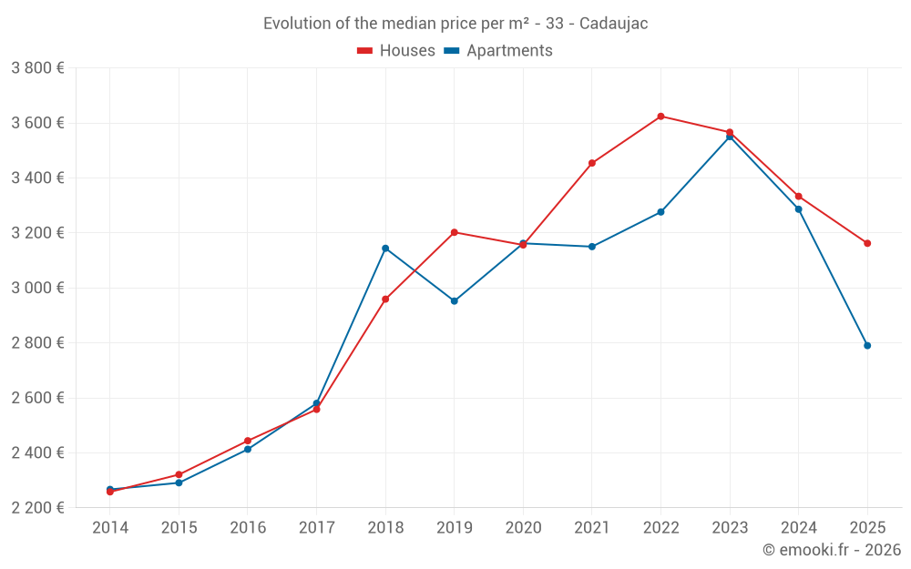 The median price on the 29 house transactions of the last 6 months in the municipality of Cadaujac was 3 162 € per square meter for a median property value of 260 000 €. Over this period, 60% of transactions were between 1 854 and 3 496 € per square meter (from the 2nd to the 8th deciles).