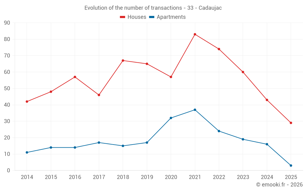 The median price on the 29 apartment transactions of the last 24 months in the municipality of Cadaujac was 3 333 € per square meter for a median property value of 160 000 €. Over this period, 60% of transactions were between 2 801 and 3 622 € per square meter (from the 2nd to the 8th deciles).